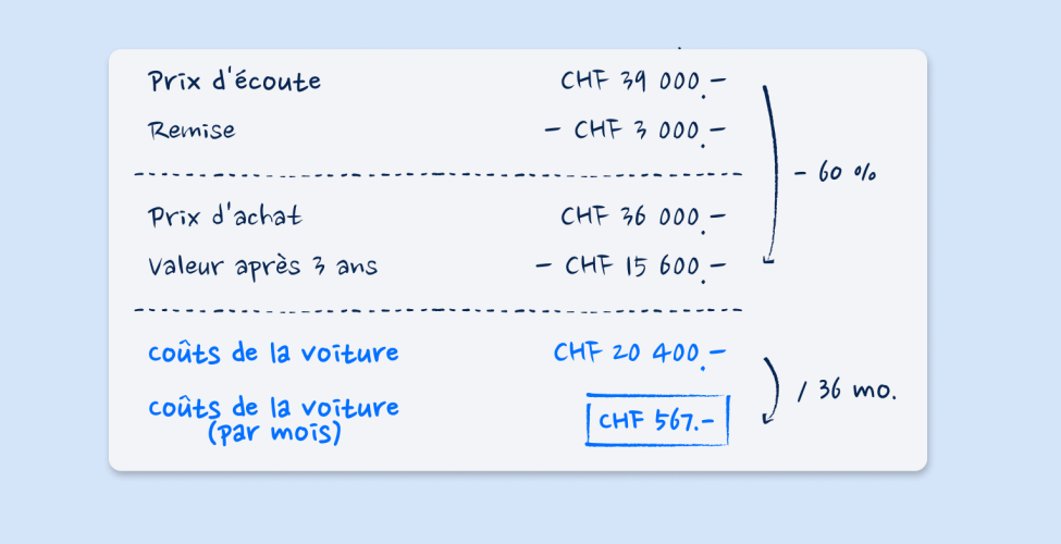 La différence entre le prix d’achat après remise (36’000 francs) et la valeur résiduelle (15’600 francs) est de 20’400 francs. C’est le montant que la voiture vous coûte réellement pendant cette période. Réparti sur 36 mois, cela représente 567 francs par mois – uniquement pour la voiture.
